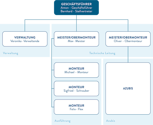 Spätestens, wenn es eine zweite Führungsebene im Elektrobetrieb gibt, zum Beispiel einen Meister, der Projekte abwickelt und die Azubis betreut, ist das Organigramm zwingend erforderlich.